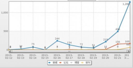 此话题相关舆情热度出现爆发性增长,当天的相关网络新闻超过1200篇,19日这一数字更是继续猛增到1600余篇。2月18日相关微博接近17000条。2月20日这一数字更是继续猛增到30000余条。